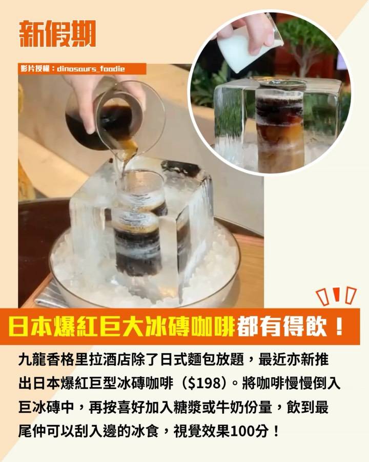 九龍香格里拉酒店除了日式麵包放題,最近亦新推出日本爆紅巨型冰磚咖啡($198)。將咖啡慢慢倒入巨冰磚中,再按喜好加入糖漿或牛奶份量,飲到最尾仲可以刮入邊的冰食,視覺效果100分!