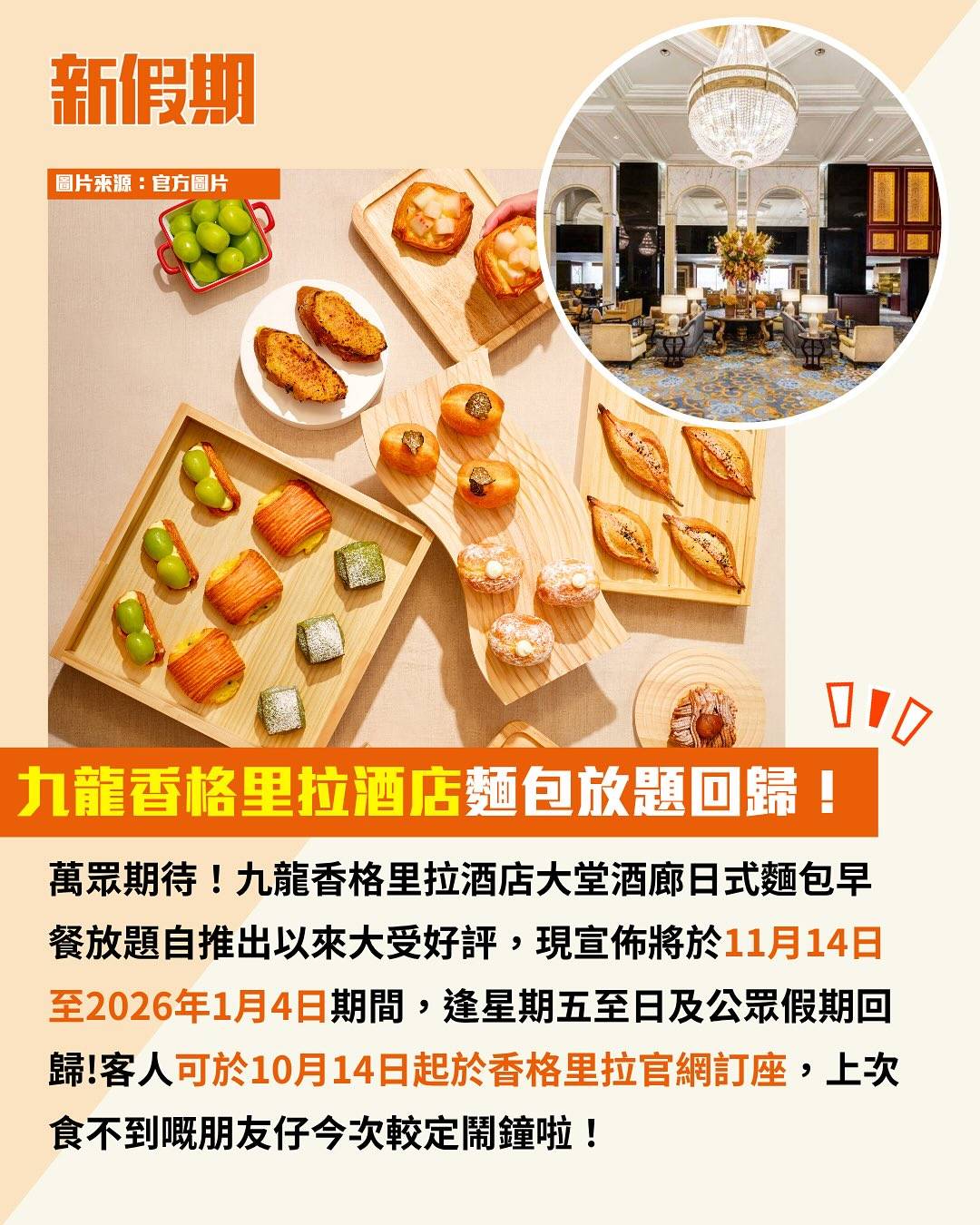 萬眾期待!九龍香格里拉酒店大堂酒廊日式麵包早餐放題自推出以來大受好評,現宣佈將於11月14日至2026年1月4日期間,逢星期五至日及公眾假期回歸!客人可於10月14日起於香格里拉官網訂座,上次食不到嘅朋友仔今次較定鬧鐘啦!