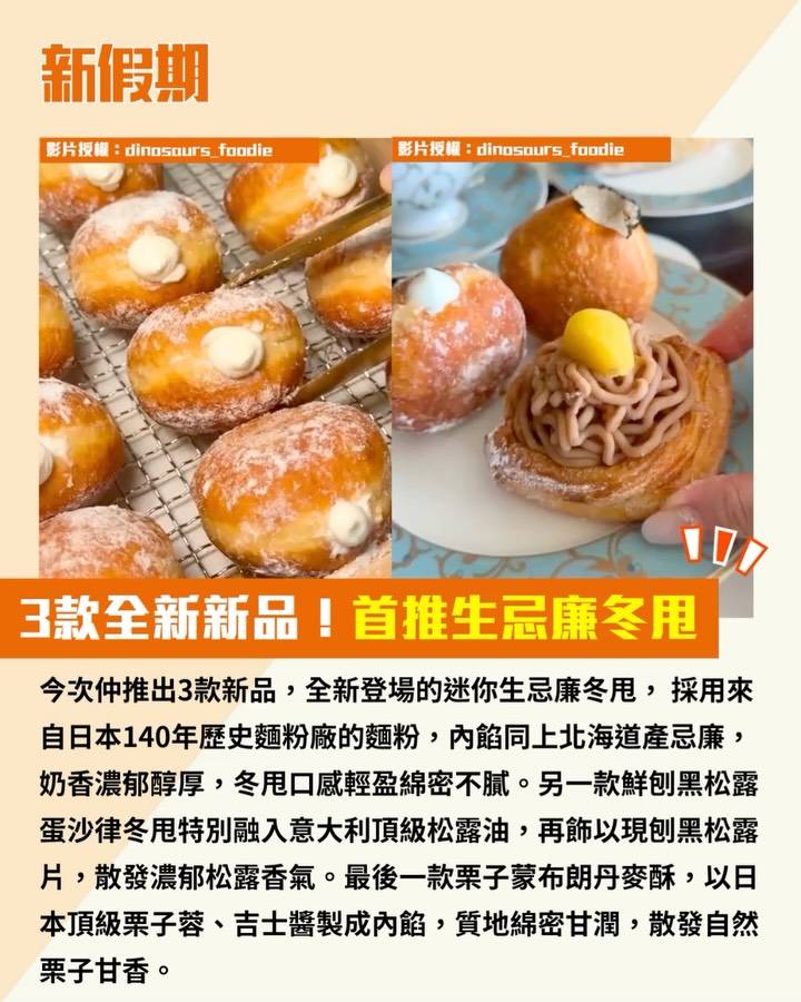 今次仲推出3款新品,全新登場的迷你生忌廉冬甩, 採用來自日本140年歷史麵粉廠的麵粉,內餡同上北海道產忌廉,奶香濃郁醇厚,冬甩口感輕盈綿密不膩。另一款鮮刨黑松露蛋沙律冬甩特別融入意大利頂級松露油,再飾以現刨黑松露片,散發濃郁松露香氣。最後一款栗子蒙布朗丹麥酥,以日本頂級栗子蓉、吉士醬製成內餡,質地綿密甘潤,散發自然栗子甘香。