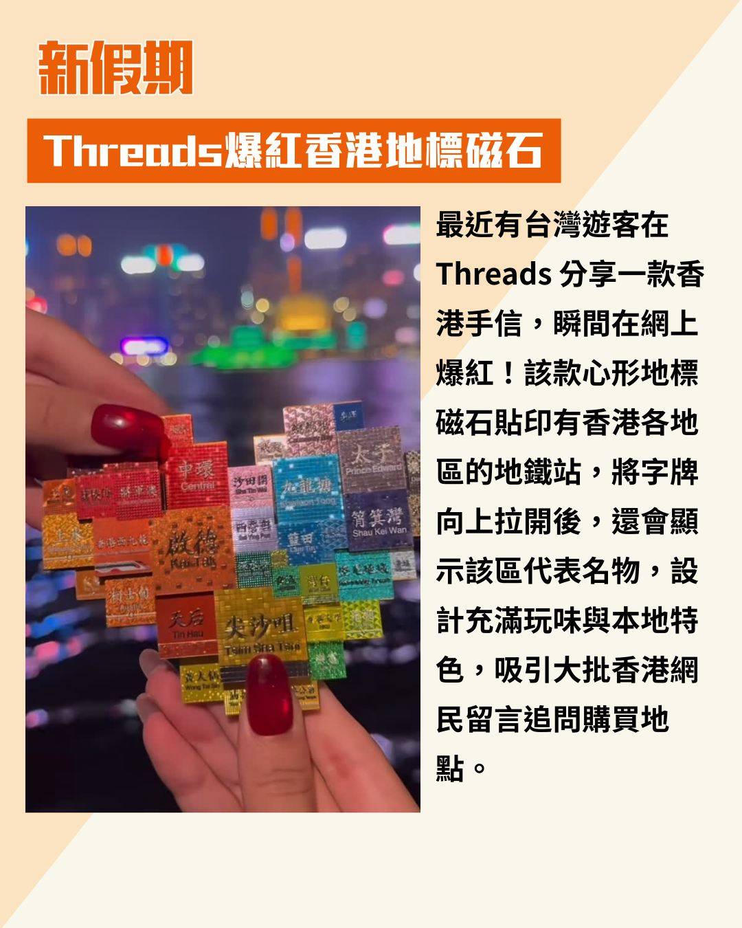 最近有台灣遊客在 Threads 分享一款香港手信,瞬間在網上爆紅!該款心形地標磁石貼印有香港各地區的地鐵站,將字牌向上拉開後,還會顯示該區代表名物,設計充滿玩味與本地特色,吸引大批香港網民留言追問購買地點。