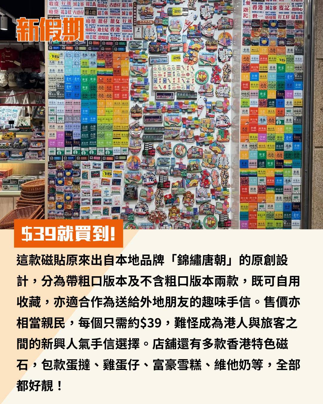 這款磁貼原來出自本地品牌「錦繡唐朝」的原創設計,分為帶粗口版本及不含粗口版本兩款,既可自用收藏,亦適合作為送給外地朋友的趣味手信。售價亦相當親民,每個只需約$39,難怪成為港人與旅客之間的新興人氣手信選擇。店舖還有多款香港特色磁石,包款蛋撻、雞蛋仔、富豪雪糕、維他奶等,全部都好靚!