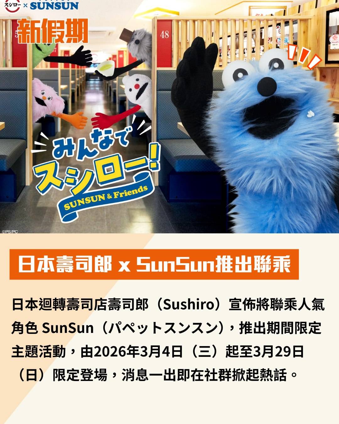 日本迴轉壽司店壽司郎(Sushiro)宣佈將聯乘人氣角色 SunSun(パペットスンスン),推出期間限定主題活動,由2026年3月4日(三)起至3月29日(日)限定登場,消息一出即在社群掀起熱話。