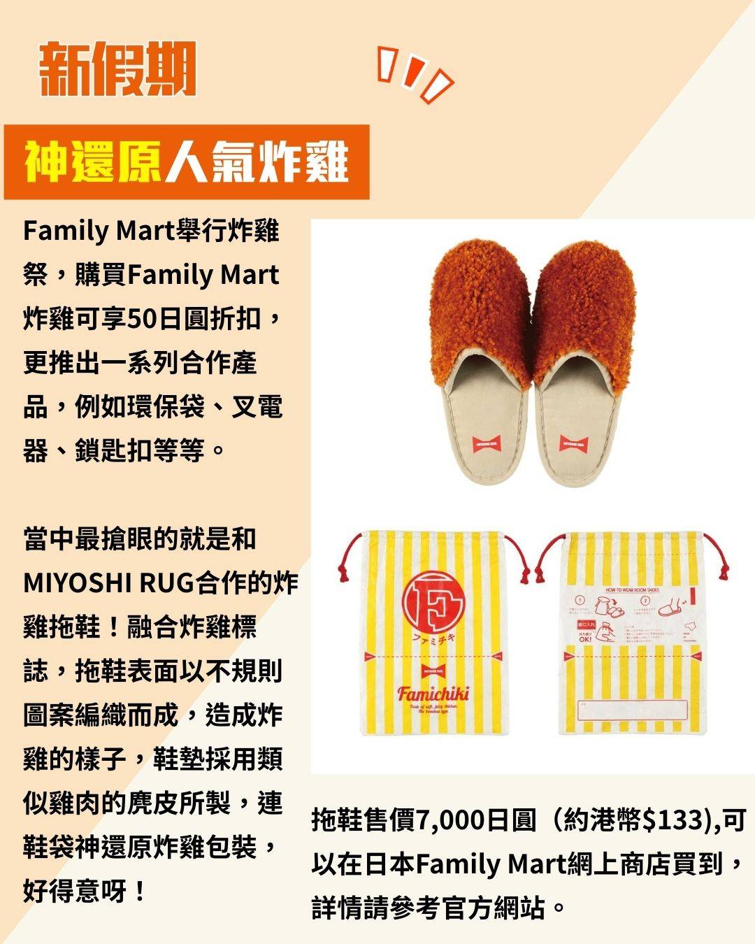 每次去日本旅遊,Family Mart的炸雞一定要吃!現在有機會可以帶炸雞返屋企啦,就是Family Mart與日本人氣手工地毯品牌MIYOSHI RUG合作的炸雞拖鞋!MIYOSHI RUG是一個來自日本、歷史超過50年的手工地毯品牌,堅持純手工製作,深受不少時尚潮人追捧!