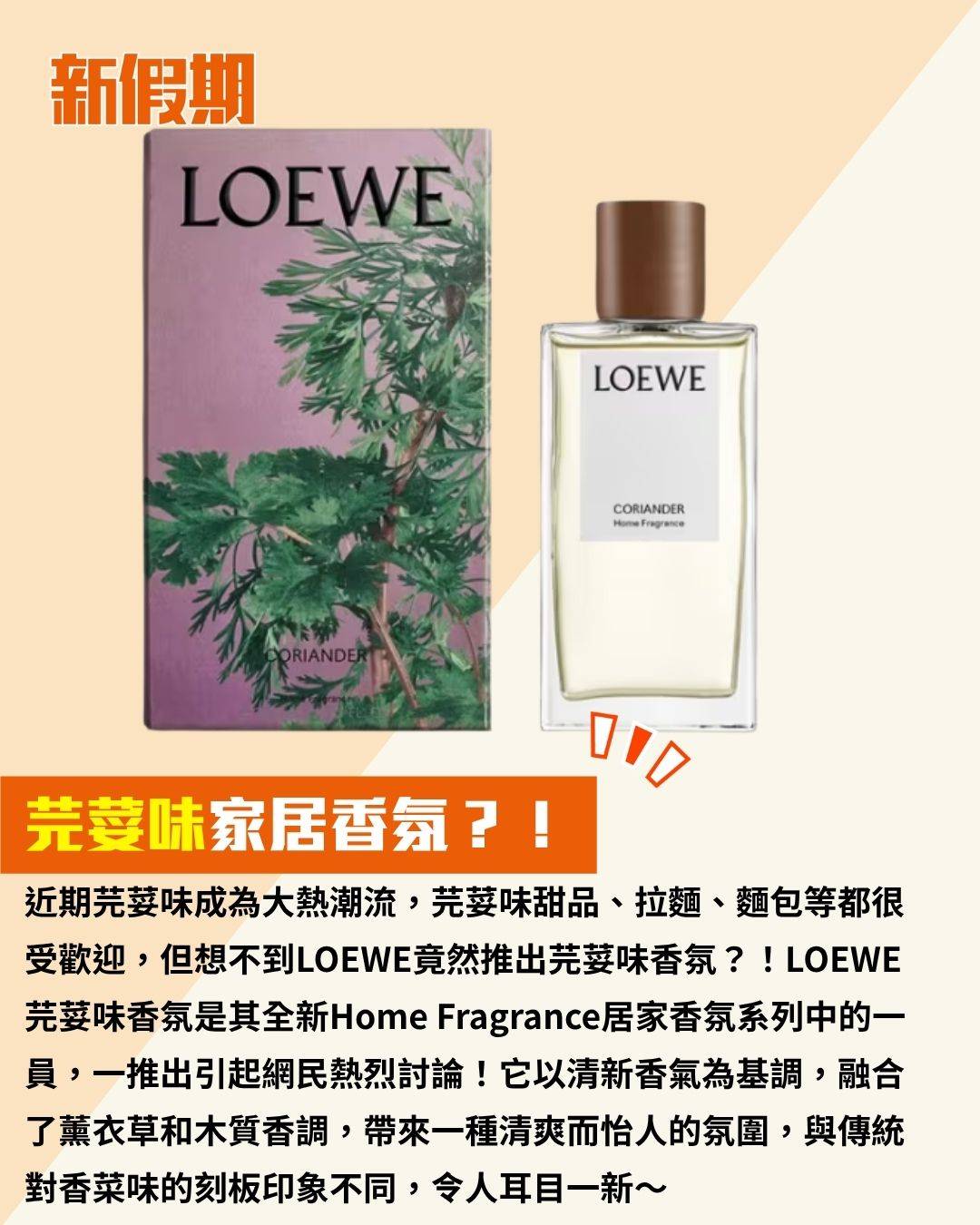 近期芫荽味成為大熱潮流,芫荽味甜品、拉麵、麵包等都很受歡迎,但想不到LOEWE竟然推出芫荽味香氛?!LOEWE芫荽味香氛是其全新Home Fragrance居家香氛系列中的一員,一推出引起網民熱烈討論!它以清新香氣為基調,融合了薰衣草和木質香調,帶來一種清爽而怡人的氛圍,與傳統對香菜味的刻板印象不同,令人耳目一新~