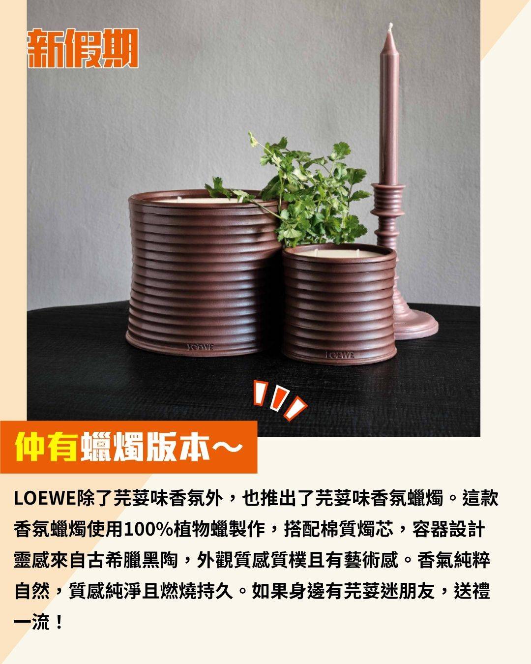 LOEWE除了芫荽味香氛外,也推出了芫荽味香氛蠟燭。這款香氛蠟燭使用100%植物蠟製作,搭配棉質燭芯,容器設計靈感來自古希臘黑陶,外觀質感質樸且有藝術感。香氣純粹自然,質感純淨且燃燒持久。如果身邊有芫荽迷朋友,送禮一流!