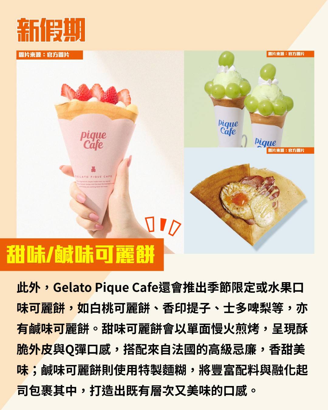 此外,Gelato Pique Cafe還會推出季節限定或水果口味可麗餅,如白桃可麗餅、香印提子、士多啤梨等,亦有鹹味可麗餅。甜味可麗餅會以單面慢火煎烤,呈現酥脆外皮與Q彈口感,搭配來自法國的高級忌廉,香甜美味;鹹味可麗餅則使用特製麵糊,將豐富配料與融化起司包裹其中,打造出既有層次又美味的口感。