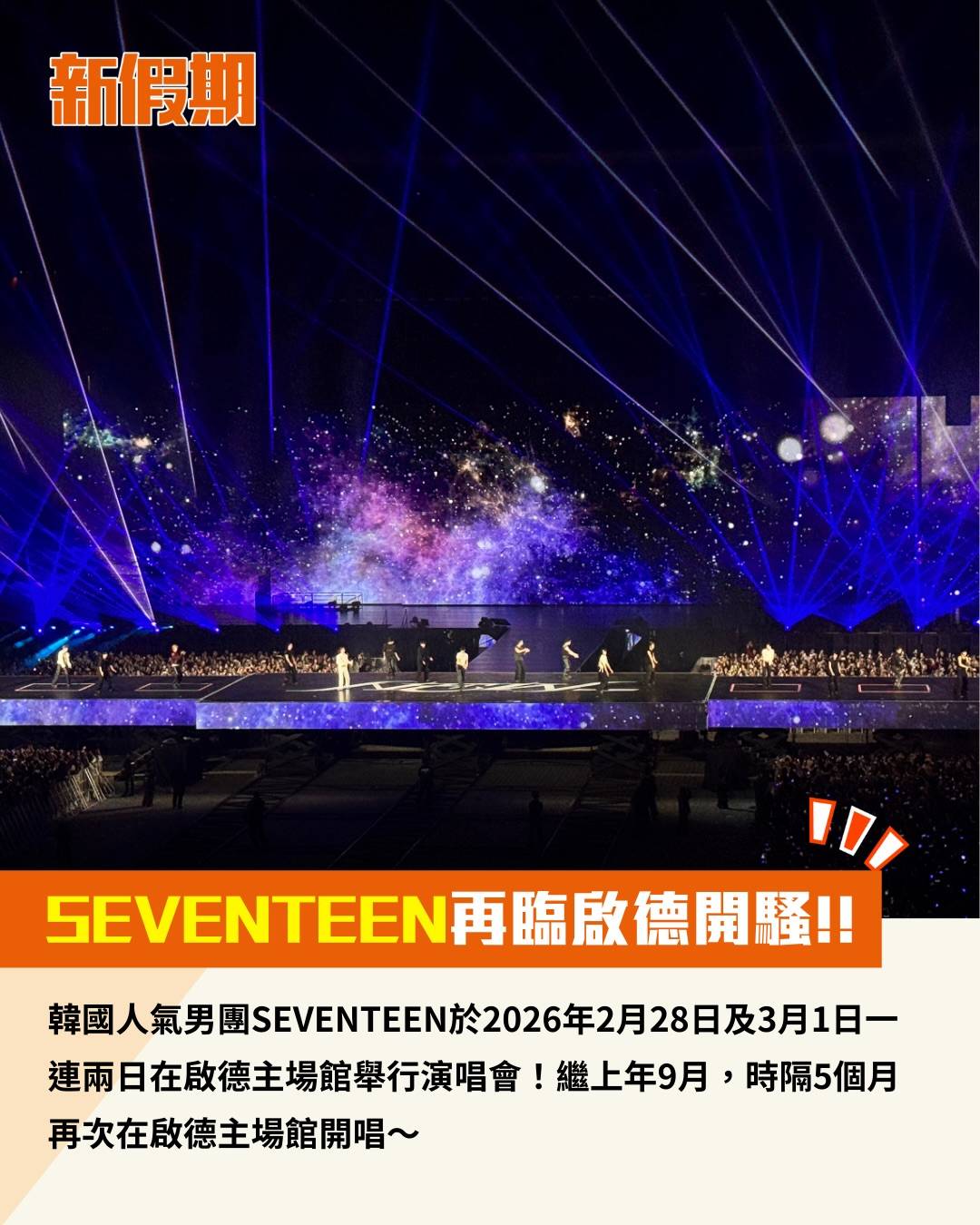 韓國人氣男團SEVENTEEN於2026年2月28日及3月1日一連兩日在啟德主場館舉行演唱會!繼上年9月,時隔5個月再次在啟德主場館開唱~