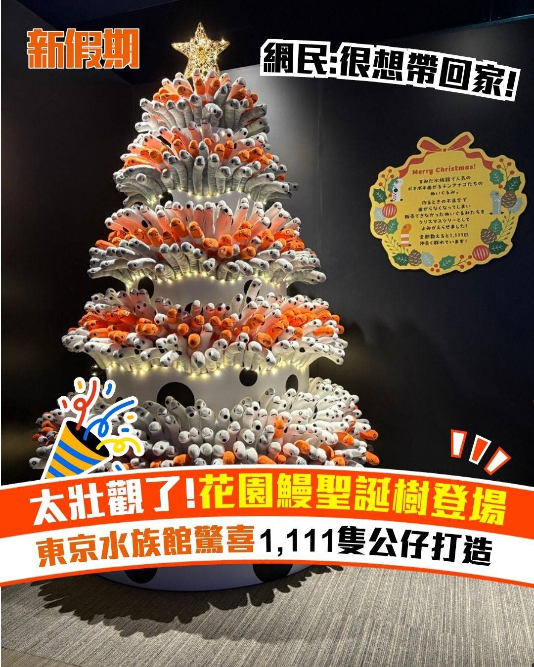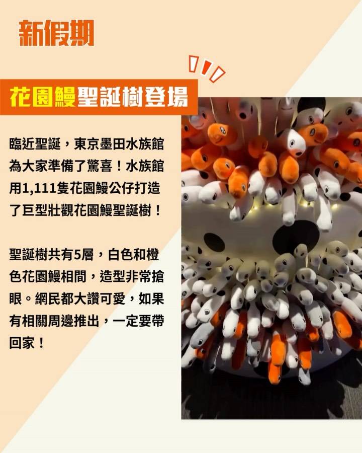 聖誕樹共有5層,白色和橙色花園鰻相間,造型非常搶眼。網民都大讚可愛,如果有相關周邊推出,一定要帶回家!