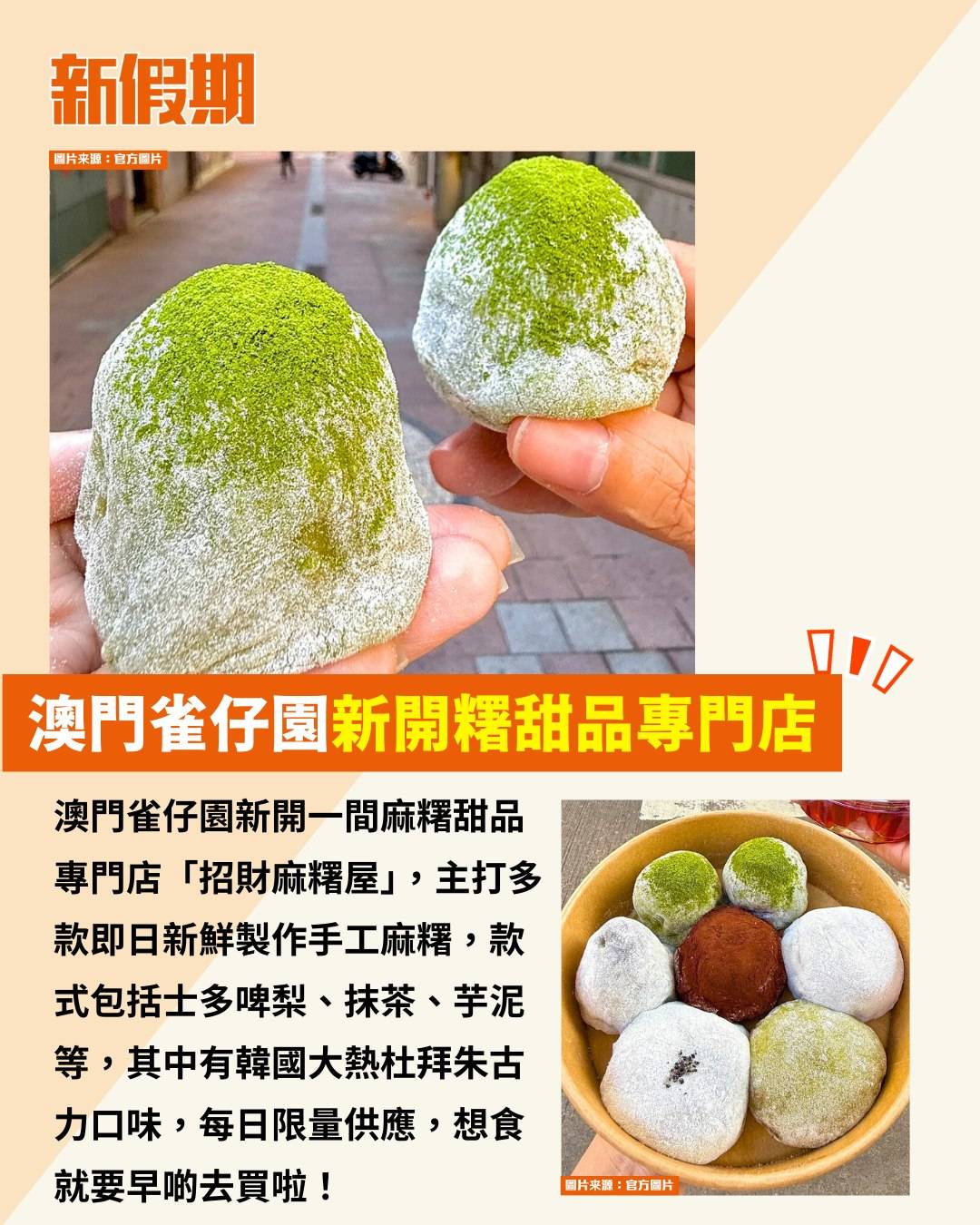 澳門雀仔園新開一間麻糬甜品專門店「招財麻糬屋」,主打多款即日新鮮製作手工麻糬,款式包括士多啤梨、抹茶、芋泥等,其中有韓國大熱杜拜朱古力口味,每日限量供應,想食就要早啲去買啦!