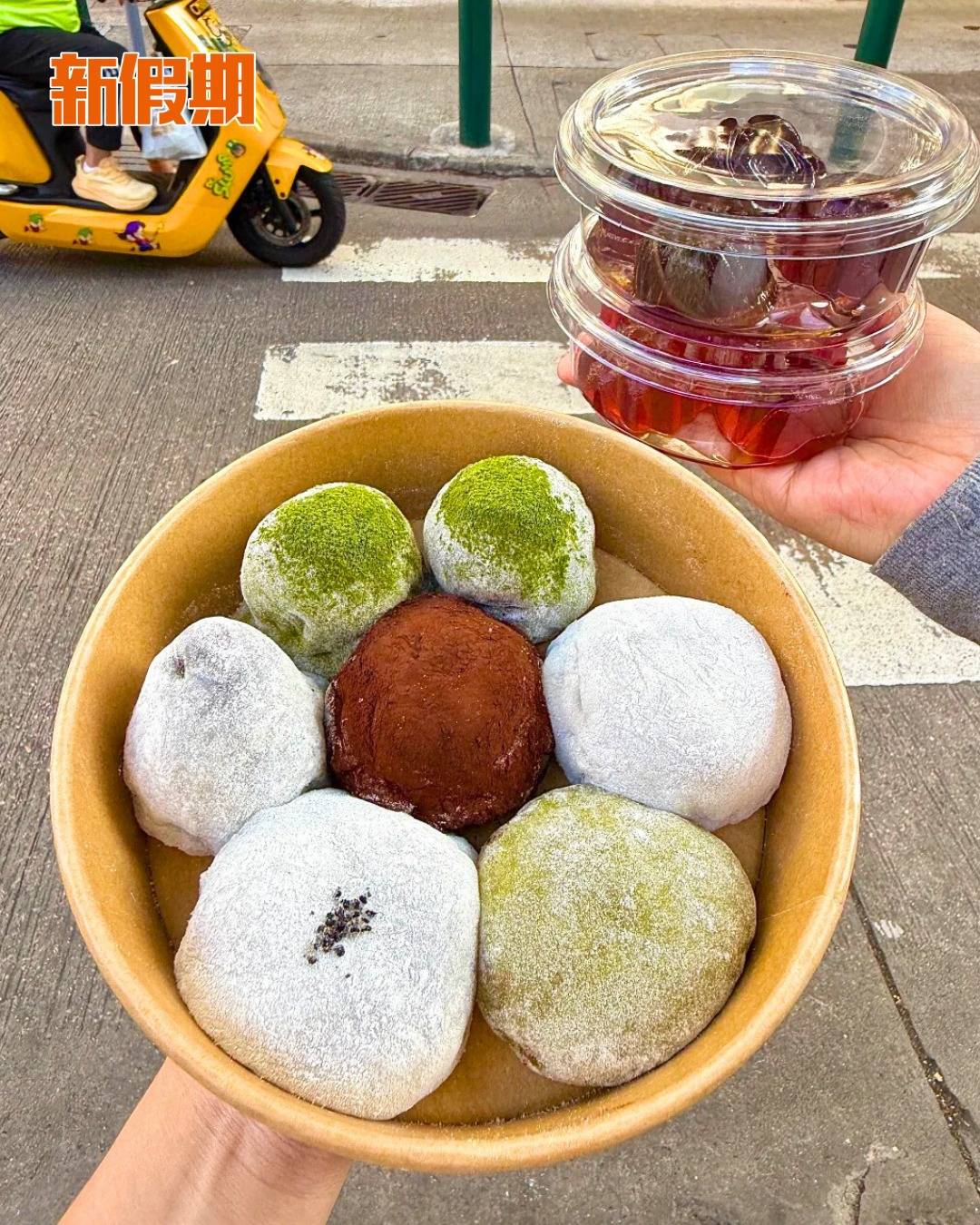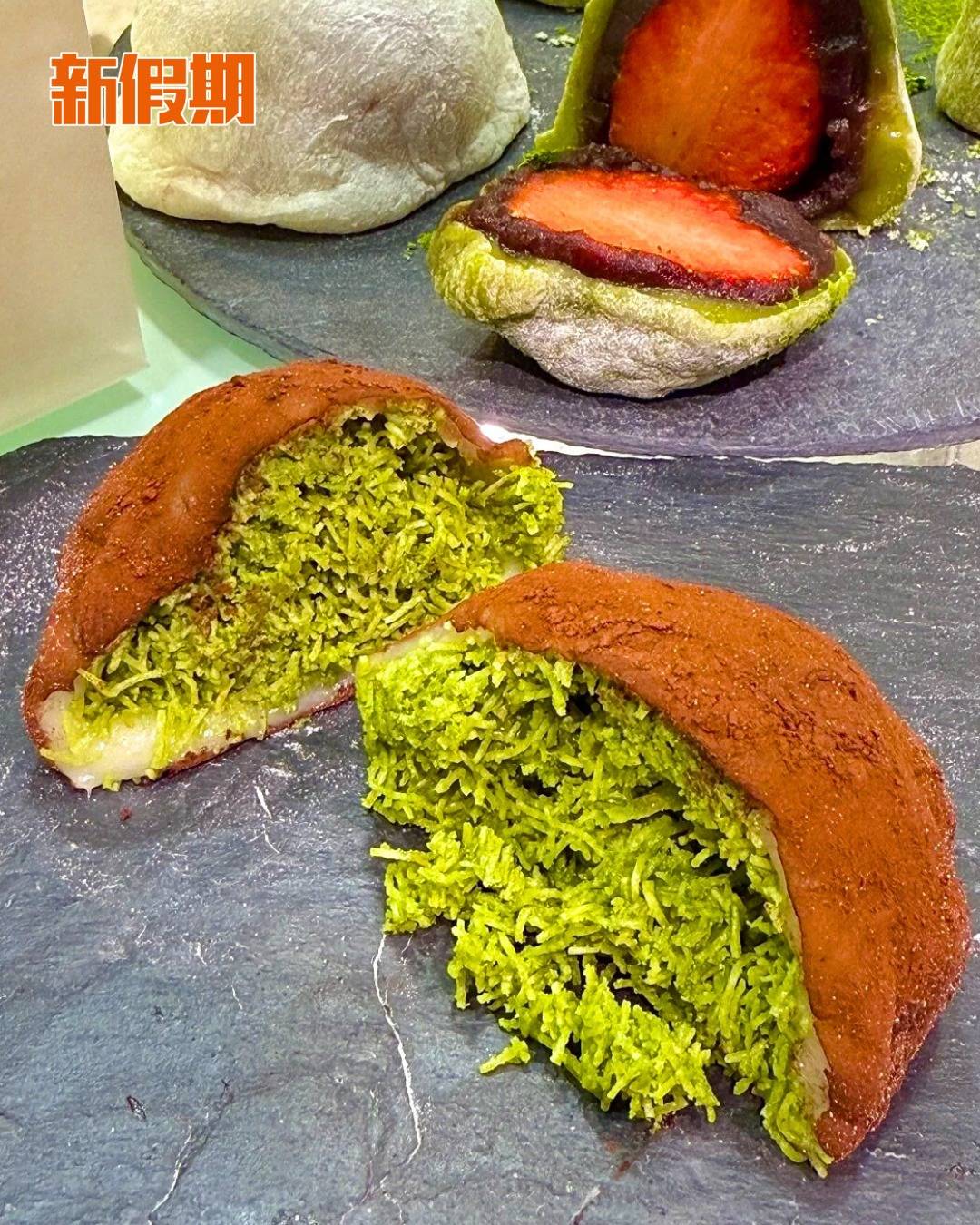 必食杜拜朱古力口味,外層是軟糯煙韌的糯米皮,表面滾滿可可粉,看起來似一大粒朱古力味糯米糍;內層包住開心果醬,加上中東麵絲脆脆(Kataifi),外皮Q糯,內層脆卜卜,甜度適中,每啖都有開心果味!