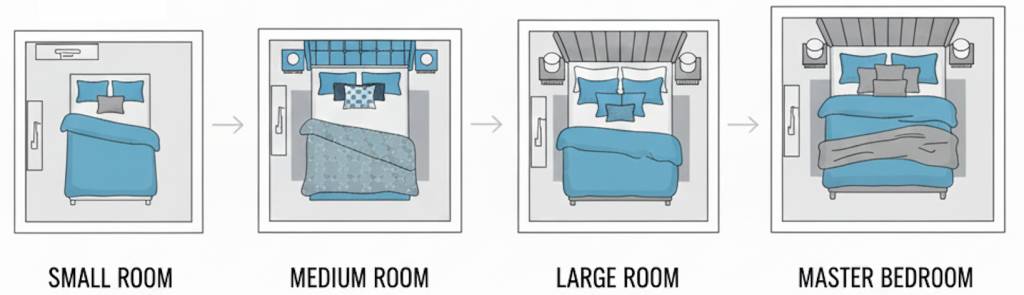 對於小房間(約116平方呎),建議Single或King Single(107 x 183 cm),避免擁擠。中等房間(176平方呎)適合Double或Queen,提供平衡舒適。大房間(230平方呎以上)可選King或Super King(183 x 203 cm)。香港房屋署數據顯示,多數單位臥室小於100平方呎,因此測量床褥四周空間至關重要。睡眠醫學專家如哈佛醫學院的研究指出,過小空間可能導致壓力增加,影響睡眠品質。