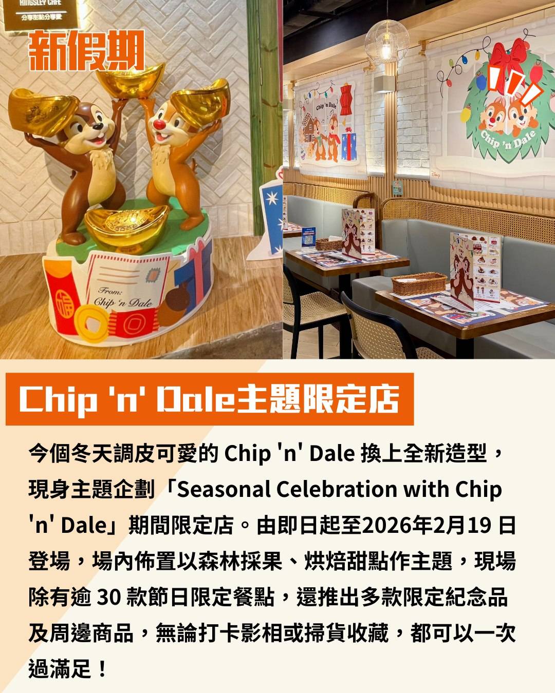 今個冬天調皮可愛的 Chip ‘n’ Dale 換上全新造型,現身企劃「Seasonal Celebration with Chip ‘n’ Dale」期間限定店。由即日起至2026年2月19 日登場,場內佈置以森林採果、烘焙甜點作主題,現場除有逾 30 款節日限定餐點,還推出多款限定紀念品及周邊商品,無論打卡影相或掃貨收藏,都可以一次過滿足!