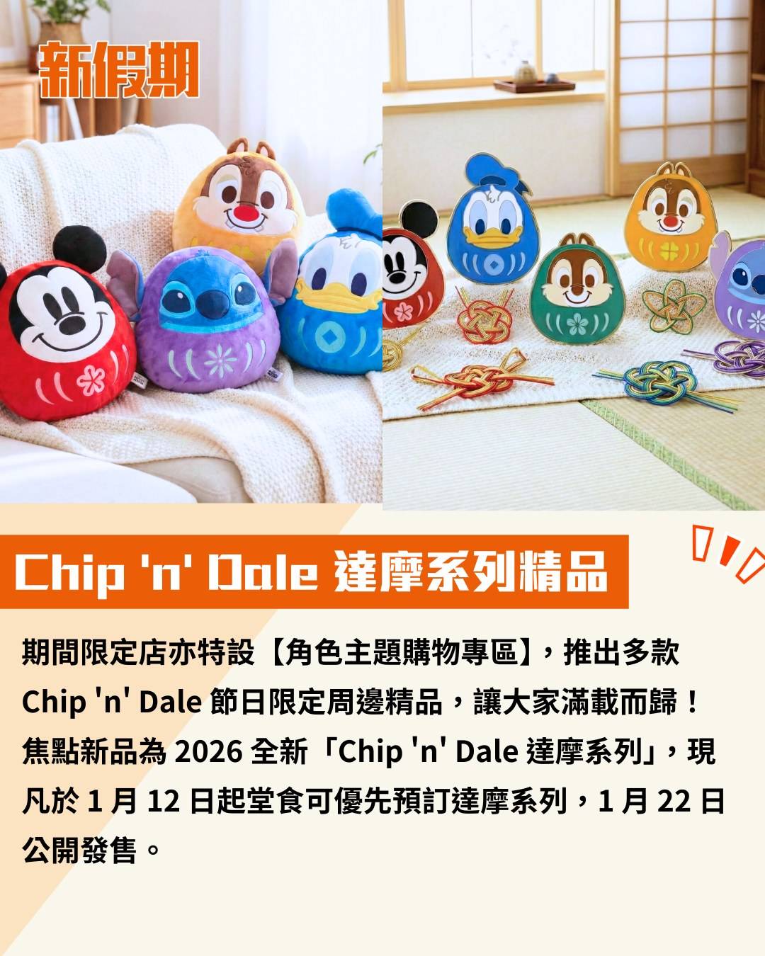 期間限定店亦特設【角色主題購物專區】,推出多款 Chip ‘n’ Dale 節日限定周邊精品,讓大家滿載而歸!焦點新品為 2026 全新「Chip ‘n’ Dale 達摩系列」,現凡於 1 月 12 日起堂食可優先預訂達摩系列,1 月 22 日公開發售。