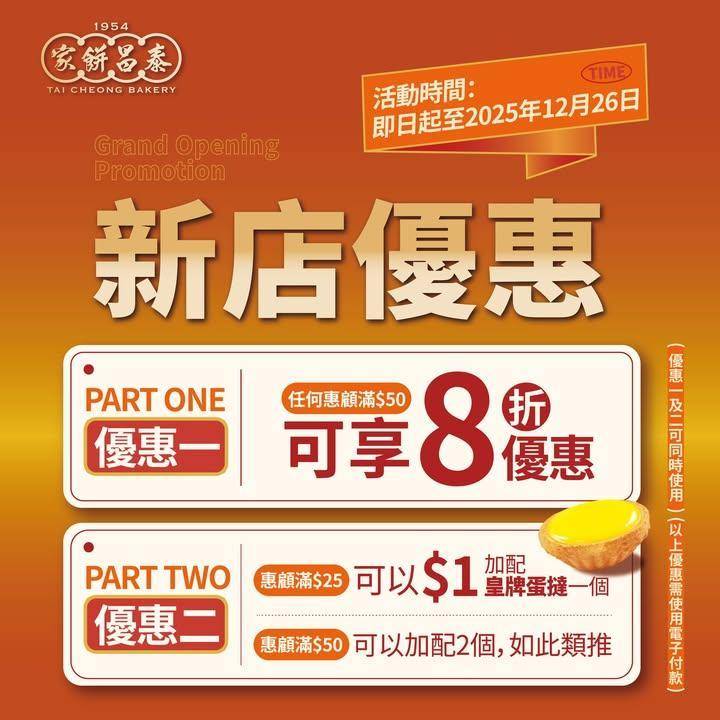 泰昌餅家 (港鐡寶琳站)|泰昌餅家是一家位於將軍澳港鐵寶琳站的經典港式麵包店,以其傳統風味和便利的位置而聞名。這家懷舊老店為繁忙的通勤者和本地居民提供了一個品嚐地道港式美食的好去處。泰昌餅家以其招牌蛋撻和各式新鮮麵包而聞名,為顧客帶來經典的港式烘焙體驗。作為一家平價的餐廳,泰昌餅家的人均消費在50港元以下,為顧客提供了高性價比的美食選擇。
