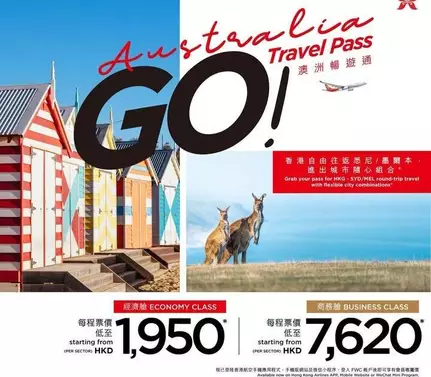 「GO Australia 澳洲暢遊通」經濟艙單程機票票價由港幣$ 1,950 起,商務艙單程票價機票港幣$ 7,620 起,立即上香港航空手機版網站、APP或微信小程序預訂,隨心組合你嘅澳洲行程,開啟自由自在嘅旅行模式:https://www.hongkongairlines.com/zh_HK/promotion/GOAusTravelPass