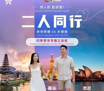 香港航空推出 ”多人同行票價優惠”,訂二人或以上商務或經濟艙機票,即享 88 折 優惠!去峇里坐高空大鞦韆、鳥巢打卡,去曼谷河畔睇日落、Rooftop 談心,去悉尼情人港 Shopping、散步、野餐。唔好猶豫,愛情同優惠一樣,都唔可以錯過架!