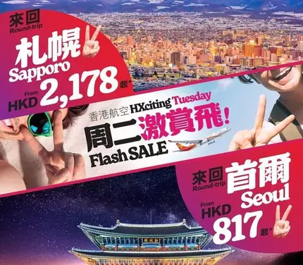 - 優惠詳情:香港航空喺指定嘅星期二推出來回及單程優惠機票,精選航點任你飛