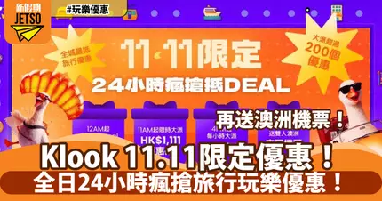 Klook 11.11限定!全日24小時瘋搶旅行玩樂優惠!全日抵Deals低至HK$11、再送澳洲機票!