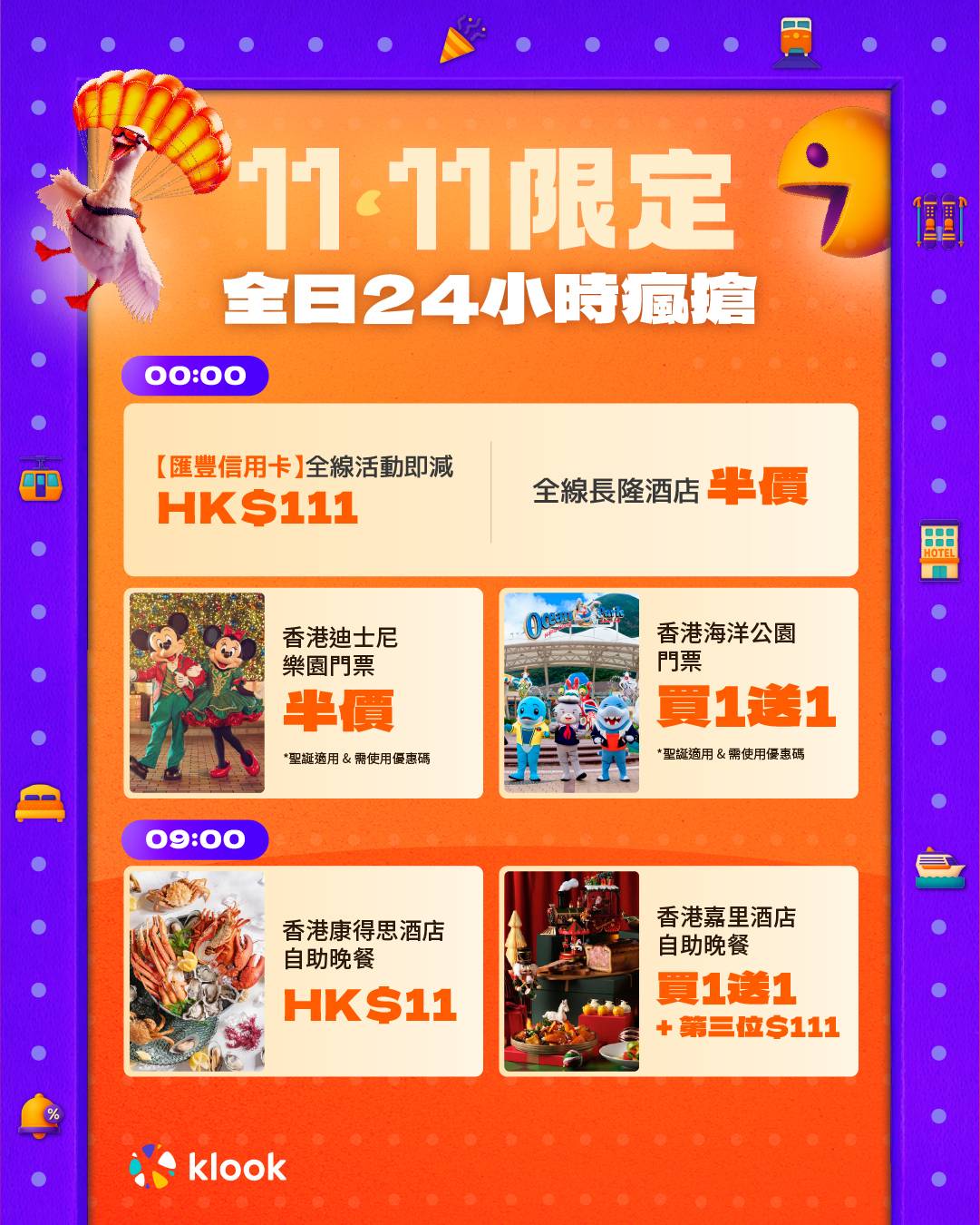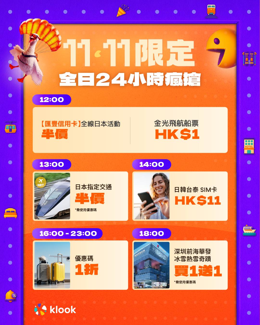 在11月11日當天,Klook將全日24小時不間斷推出震撼優惠,從凌晨12點到晚上11點,每個小時都有驚喜。