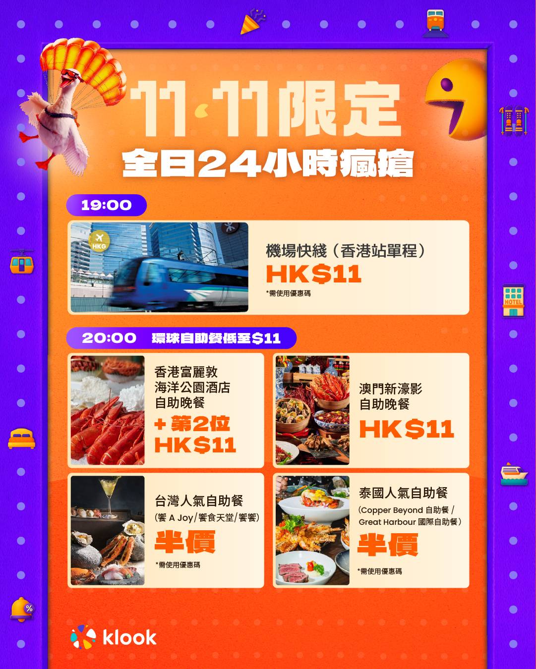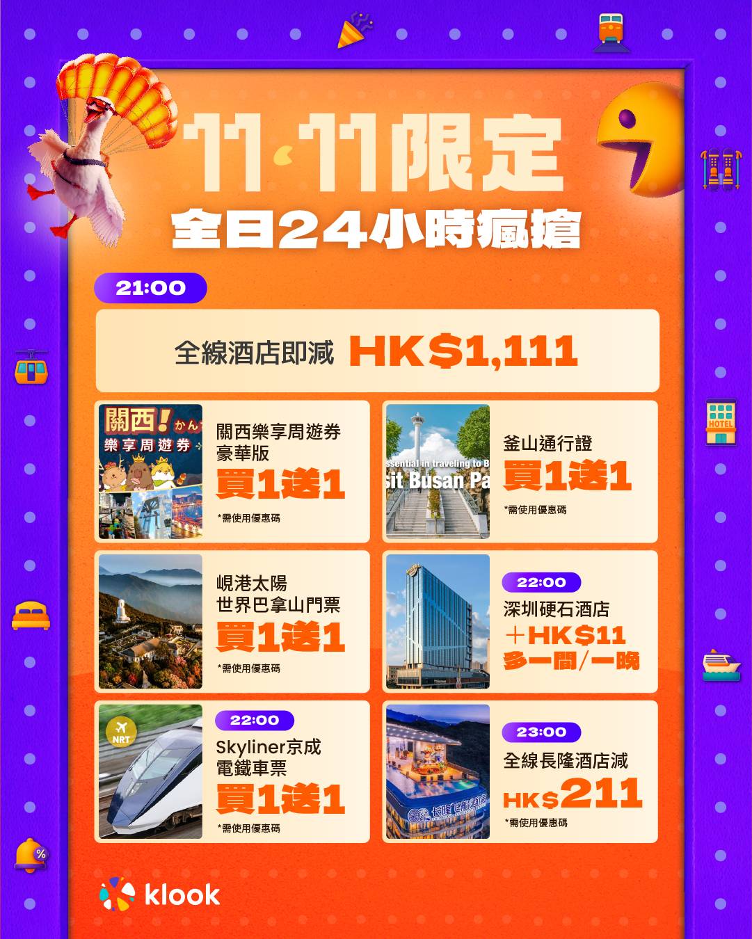 Klook將於11月11日當日5個指定時段,放送超值優惠碼。記得準時開搶!