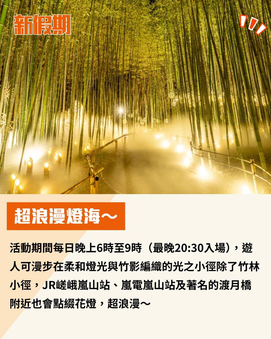 活動期間每日晚上6時至9時(最晚20:30入場),遊人可漫步在柔和燈光與竹影編織的光之小徑除了竹林小徑,JR嵯峨嵐山站、嵐電嵐山站及著名的渡月橋附近也會點綴花燈,超浪漫~