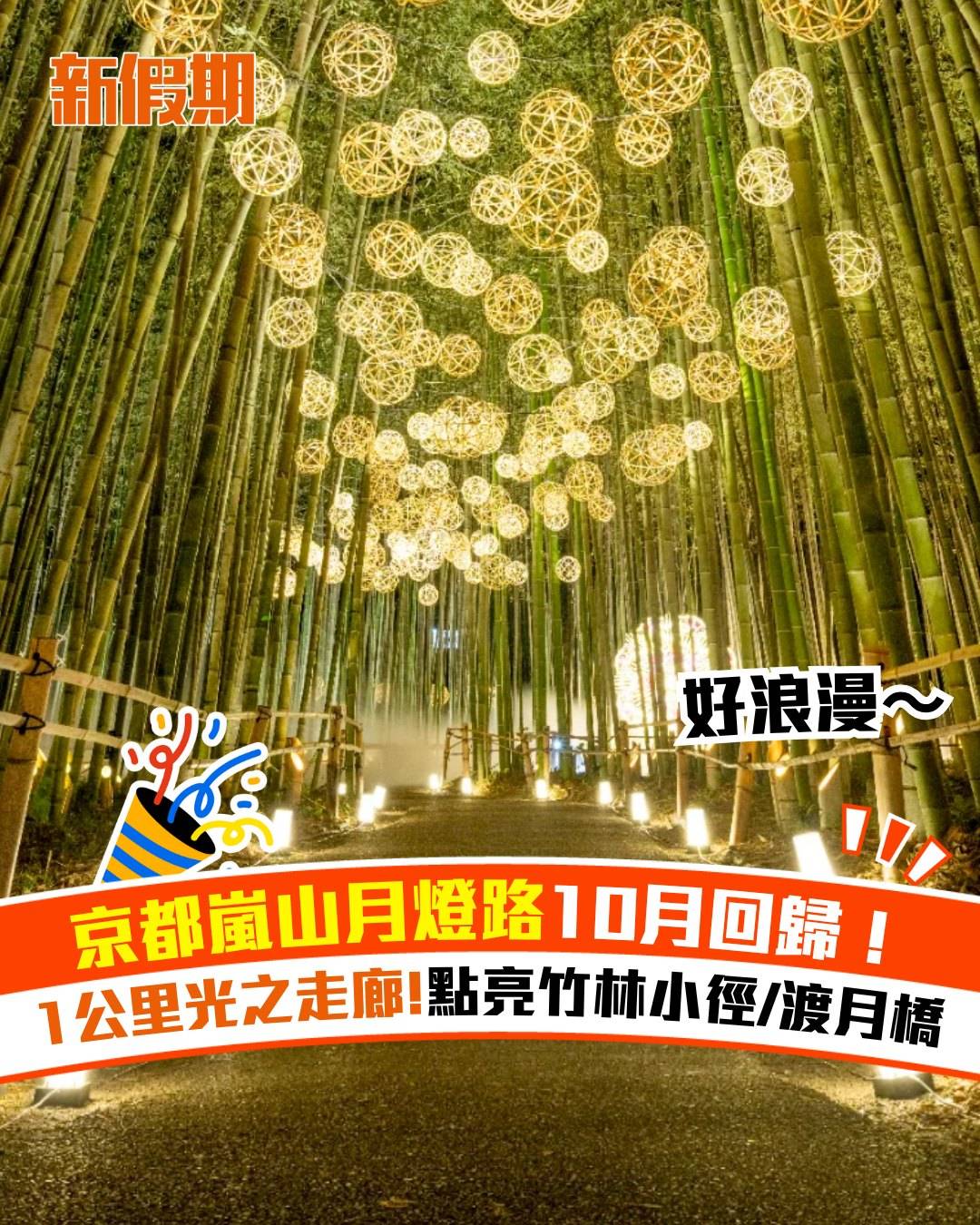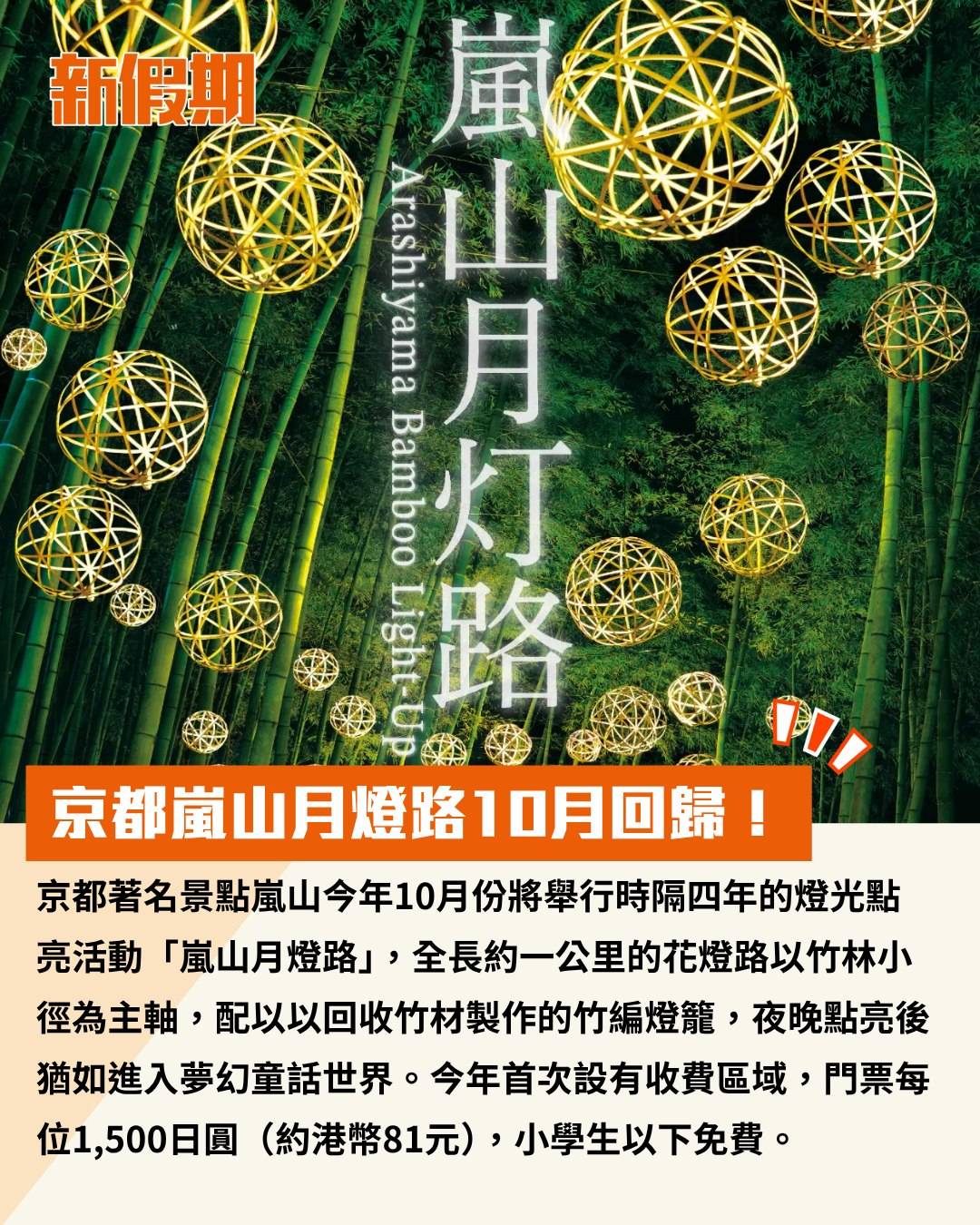京都著名景點嵐山今年10月份將舉行時隔四年的燈光點亮活動「嵐山月燈路」,全長約一公里的花燈路以竹林小徑為主軸,配以以回收竹材製作的竹編燈籠,夜晚點亮後猶如進入夢幻童話世界。今年首次設有收費區域,門票每位1,500日圓(約港幣81元),小學生以下免費。