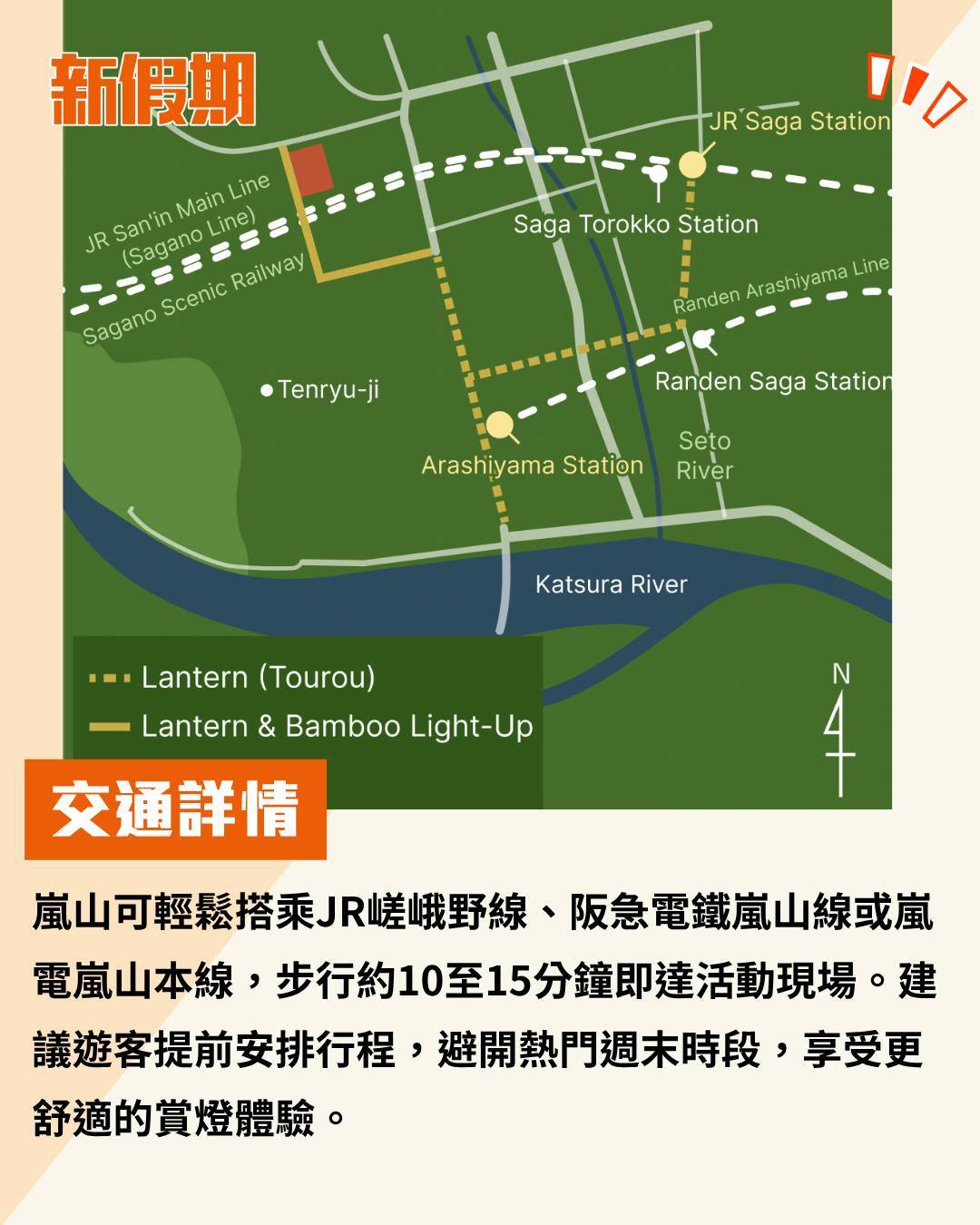 嵐山可輕鬆搭乘JR嵯峨野線、阪急電鐵嵐山線或嵐電嵐山本線,步行約10至15分鐘即達活動現場。建議遊客提前安排行程,避開熱門週末時段,享受更舒適的賞燈體驗。
