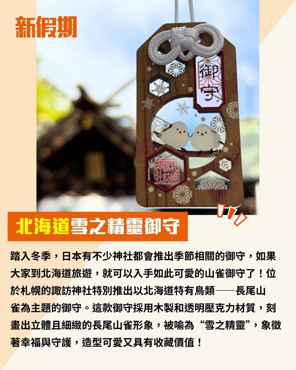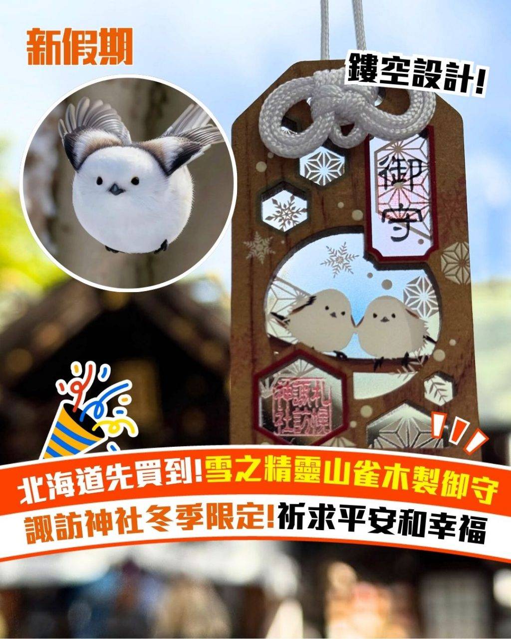 踏入冬季,日本有不少神社都會推出季節相關的御守,如果大家到北海道旅遊,就可以入手如此可愛的山雀御守了!位於札幌的諏訪神社特別推出以北海道特有鳥類——長尾山雀為主題的御守。這款御守採用木製和透明壓克力材質,刻畫出立體且細緻的長尾山雀形象,被喻為“雪之精靈”,象徵著幸福與守護,造型可愛又具有收藏價值!