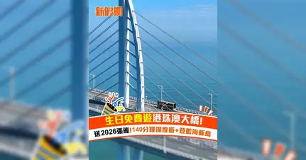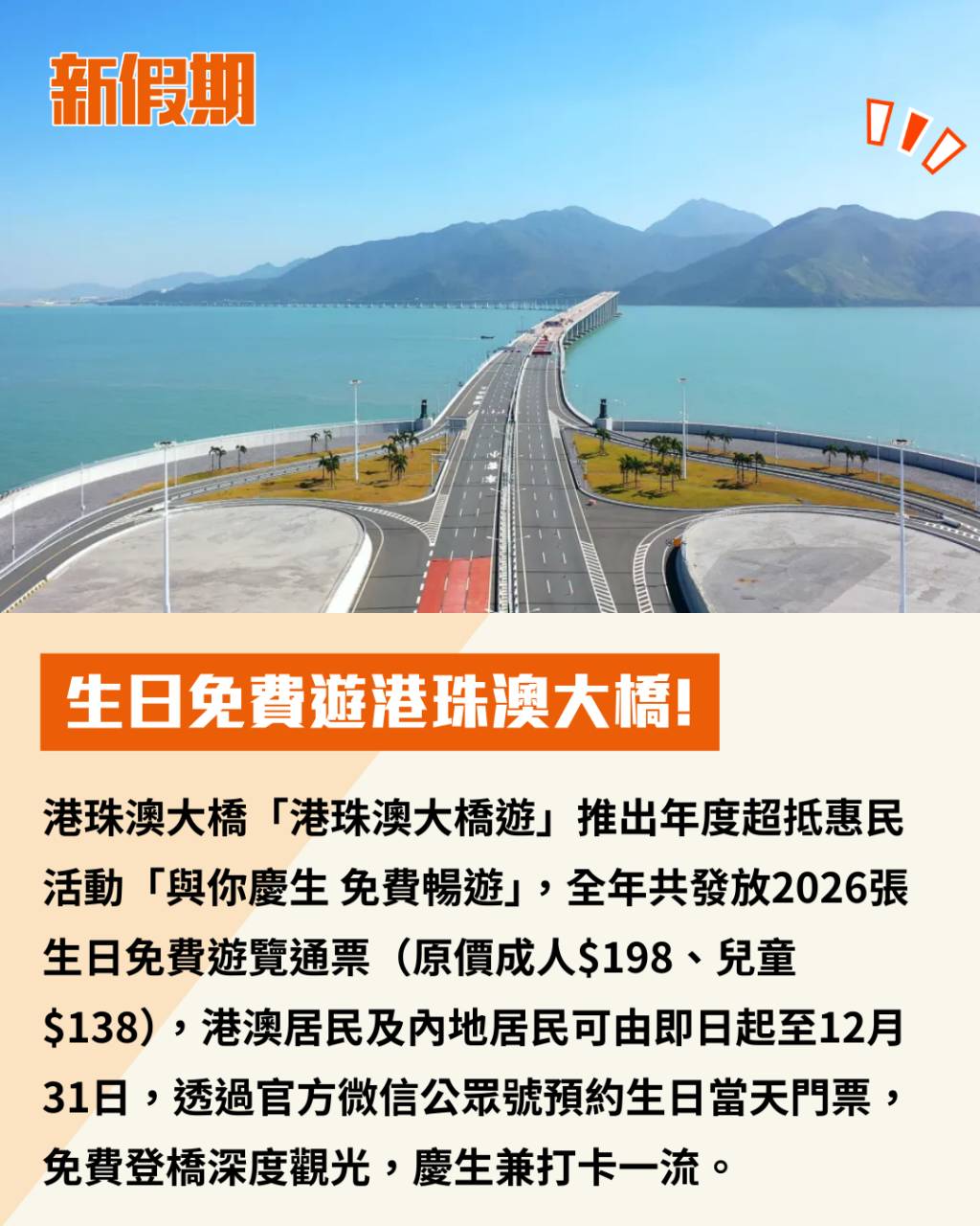 港珠澳大橋「港珠澳大橋遊」推出年度超抵惠民活動「與你慶生 免費暢遊」,全年共發放2026張生日免費遊覽通票
