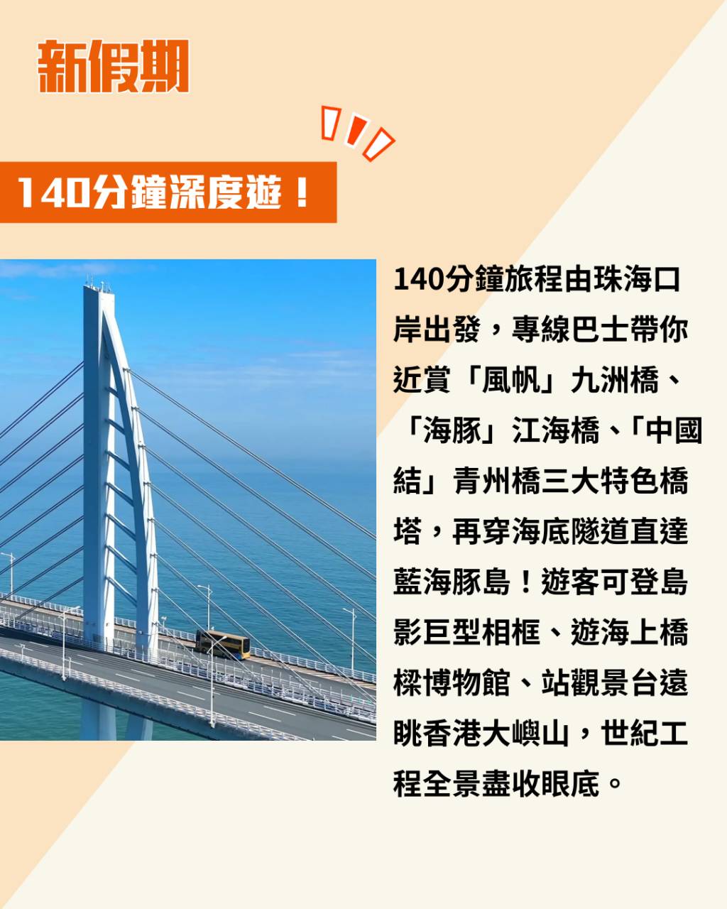 140分鐘旅程由珠海口岸出發,專線巴士帶你近賞「風帆」九洲橋、「海豚」江海橋、「中國結」青州橋三大特色橋塔,再穿海底隧道直達藍海豚島!遊客可登島影巨型相框、遊海上橋樑博物館、站觀景台遠眺香港大嶼山,世紀工程全景盡收眼底。