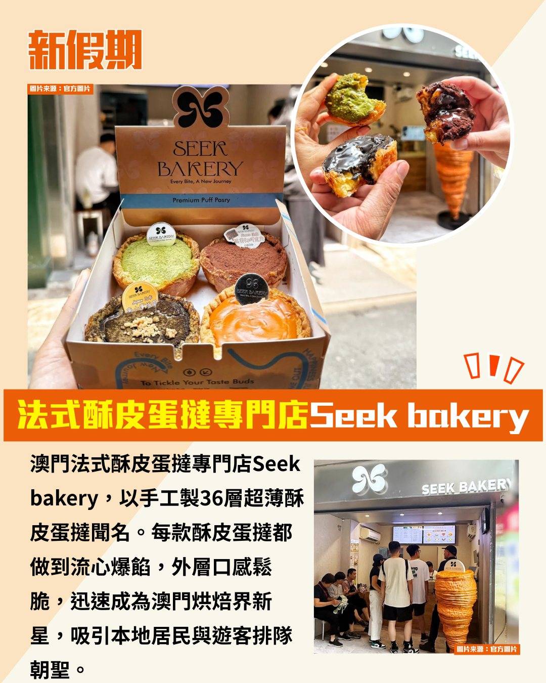 澳門法式酥皮蛋撻專門店Seek bakery,以手工製36層超薄酥皮蛋撻聞名,門面不大卻經常飄出濃郁牛油香與焗烤香氣,櫥窗中整齊排放著各款迷你酥皮撻。每款酥皮蛋撻都做到流心爆餡,外層口感鬆脆,迅速成為澳門烘焙界新星,吸引本地居民與遊客排隊朝聖。