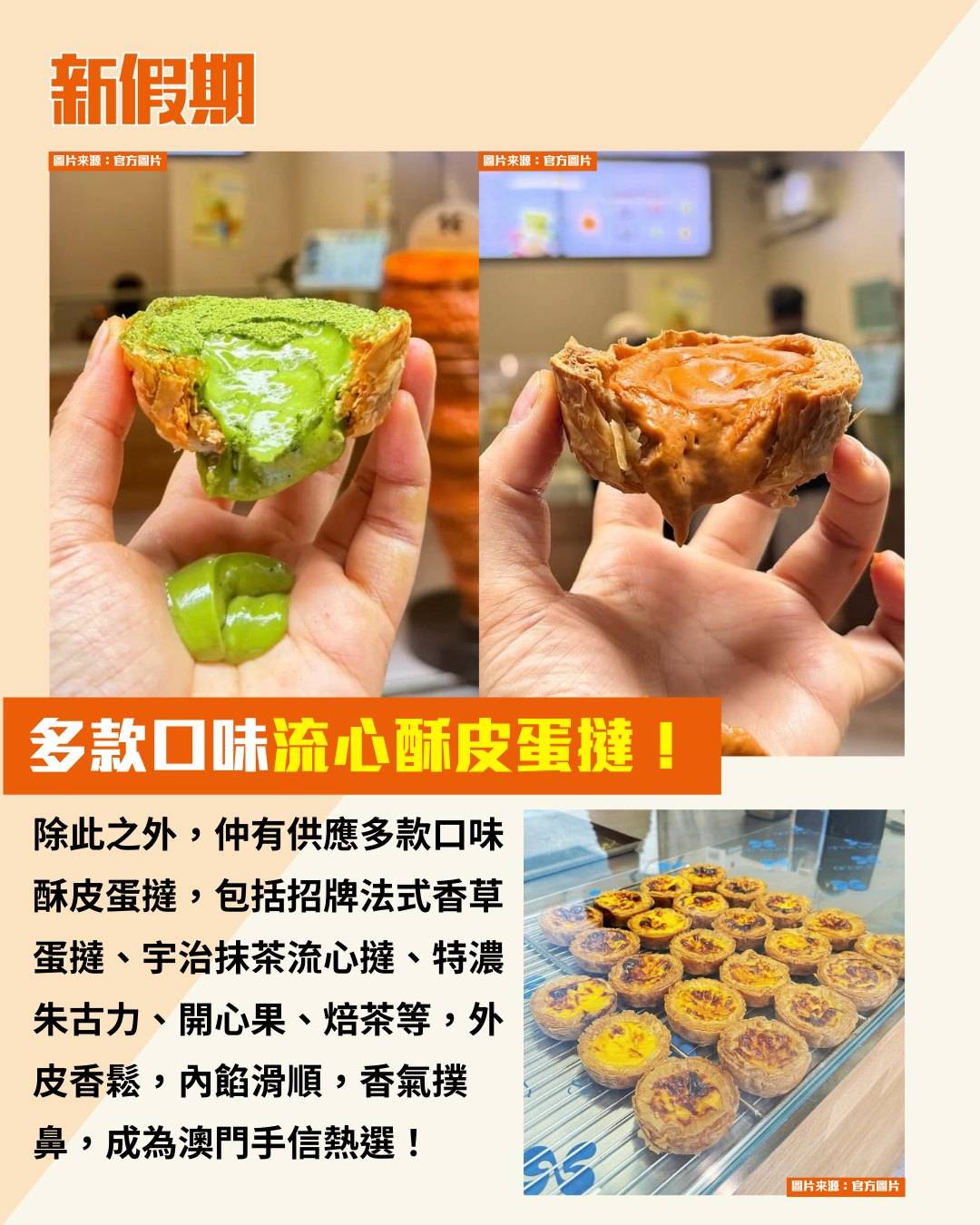 除此之外,仲有供應多款口味酥皮蛋撻,包括招牌法式香草蛋撻、宇治抹茶流心撻、特濃朱古力、開心果、焙茶等,外皮香鬆,內餡滑順,香氣撲鼻,成為澳門手信熱選!