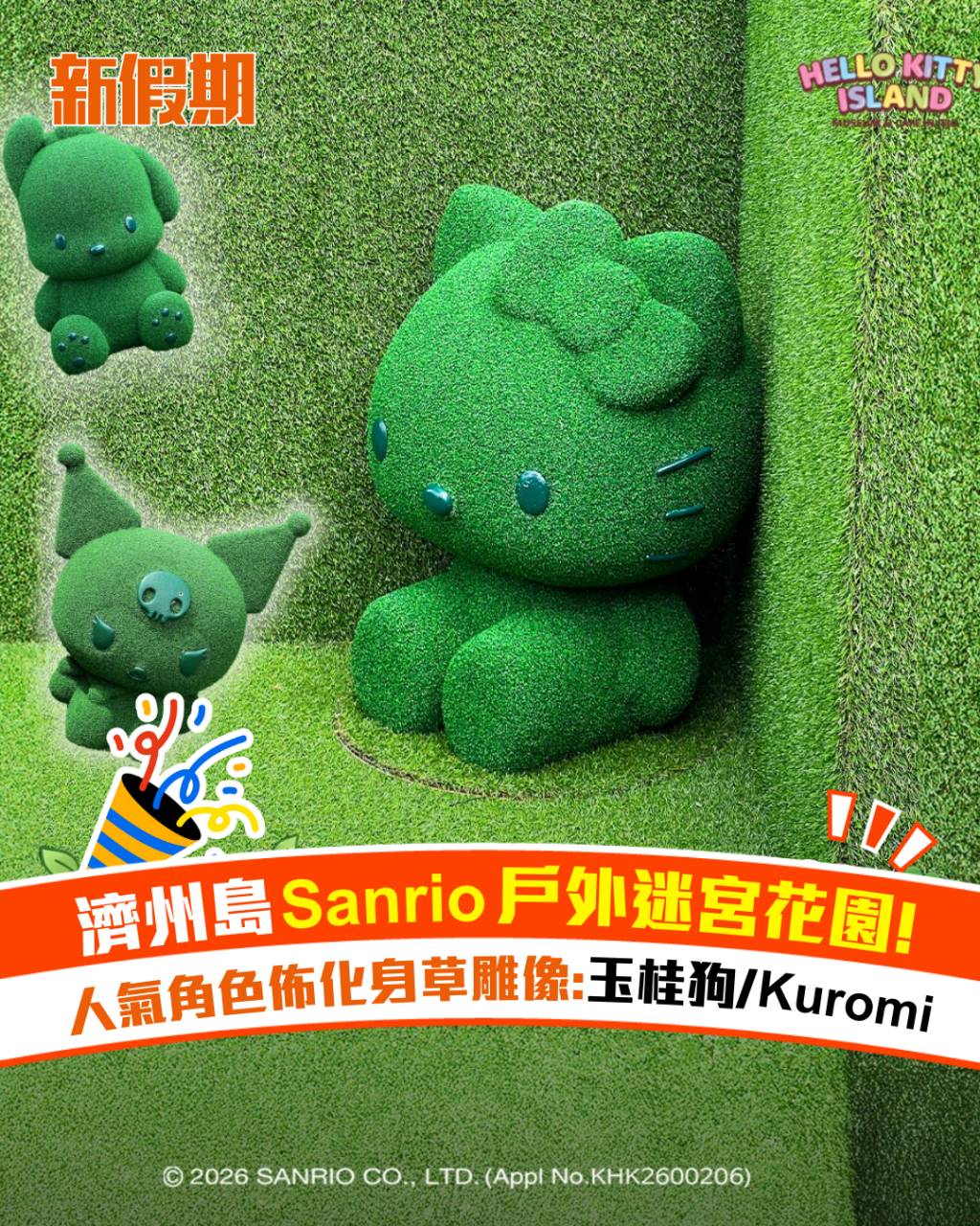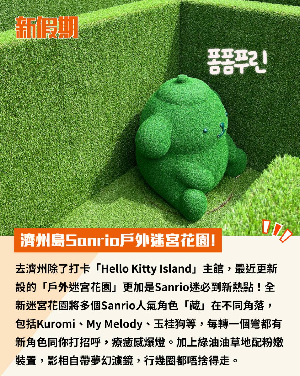 去濟州除了打卡「Hello Kitty Island」主館,最近更新設的「戶外迷宮花園」更加是Sanrio迷必到新熱點!全新迷宮花園將多個Sanrio人氣角色「藏」在不同角落,包括Kuromi、My Melody、玉桂狗等,每轉一個彎都有新角色同你打招呼,療癒感爆燈。加上綠油油草地配粉嫩裝置,影相自帶夢幻濾鏡,行幾圈都唔捨得走。