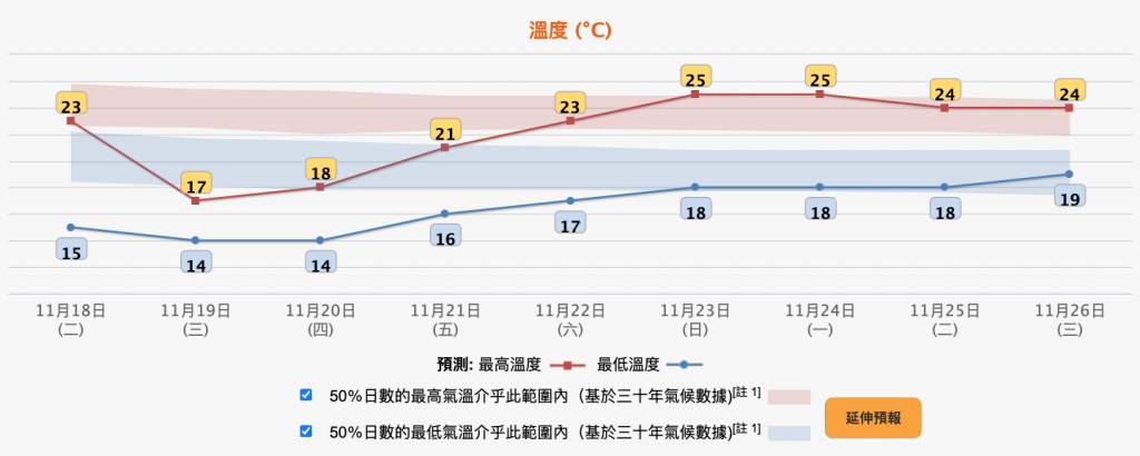 天文台已發出預測,提醒市民天氣將有顯著變化。官方預測指出:「明日(18日)天氣顯著轉涼,市區氣溫將下降至15至22度,而星期三(19日)及星期四(20日)市區氣溫更會進一步下降至14度左右,新界部分地區將會寒冷。」天文台展望,本周中期風勢頗大,並伴隨一兩陣微雨,市民應準備足夠禦寒衣物,並留意身體狀況,特別是長者及長期病患者。