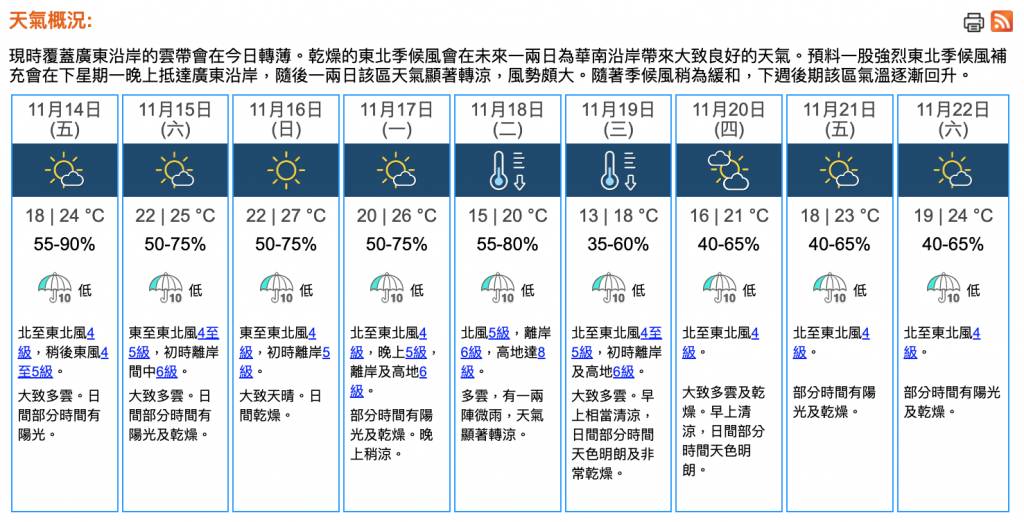 天文台指出,現時影響廣東的東北季候風會在未來一兩日稍為緩和,為本港帶來部份時間有陽光及乾燥的周末。然而,天氣形勢將在下周初逆轉,天文台預測:「一股強烈東北季候風補充會在下星期一晚上抵達廣東沿岸,隨後一兩日該區天氣顯著轉涼,風勢頗大。」除了氣溫急降,下周二更會伴隨一兩陣微雨,而下周三日間非常乾燥,市民需注意天氣變化並採取適當防護措施。