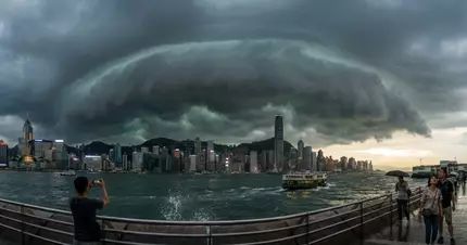 2026/04/05:清明節下午,一個雷雨區掠過港島東及將軍澳,有市民在油塘魔鬼山附近拍攝到「白天變黑夜」的驚人景象,歷時約十分鐘,顯示出雷雨胞的威力。
