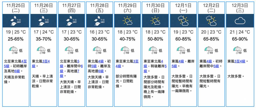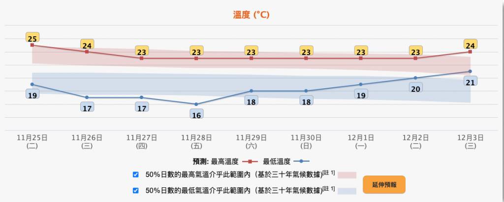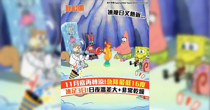 11月底再轉涼!急降最低16度 凍足3日!日夜溫差大+非常乾燥 天氣 icywt Nov 25 2025 廣告 受東北季候風及其補充持續影響,本週中後期華南普遍晴朗,天氣非常乾燥,早上清涼,日夜溫差頗大。本週三(11月26日)開始,天氣再次降溫,最低16度,最高23度。 閱讀全文 現時位於菲律賓的熱帶氣旋會在今日繼續發展並向西移動,在本週中後期橫過南海中南部,大致移向越南至海南島以南海域一帶並逐漸減弱。本週六(11月29日)開始,氣溫逐漸回升至20度以上。大家要注意溫差,小心身體! (圖片來源:香港天文台) (圖片來源:香港天文台) 關鍵詞天氣天氣預告香港天文台 圖片來源:香港天文台