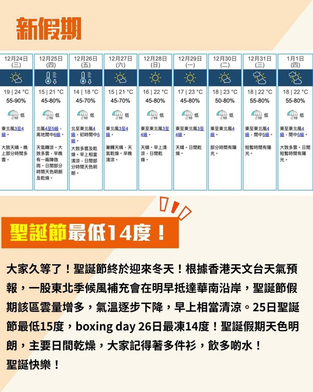 大家久等了!聖誕節終於迎來冬天!根據香港天文台天氣預報,一股東北季候風補充會在明早抵達華南沿岸,聖誕節假期該區雲量增多,氣溫逐步下降,早上相當清涼。25日聖誕節最低15度,boxing day 26日最凍14度!聖誕假期天色明朗,主要日間乾燥,大家記得著多件衫,飲多啲水!