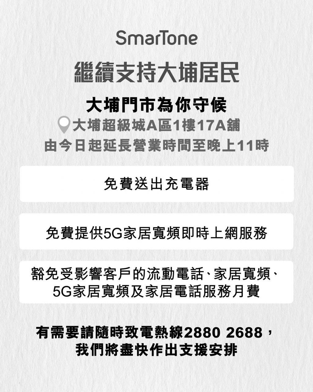 SmarTone 會豁免受影響客戶的流動電話、家居寬頻、5G家居寬頻及家居電話服務月費,而大埔分店亦由今日起延長營業時間至晚上11時,直至另行通知。並繼續提供以下支援措施: