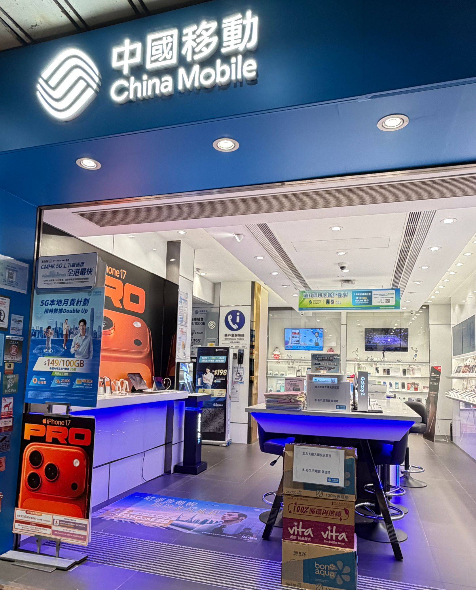門市同事準備好飲用水、毛巾,亦都可到嚟鋪頭免費借取充電寶同領取儲值卡。