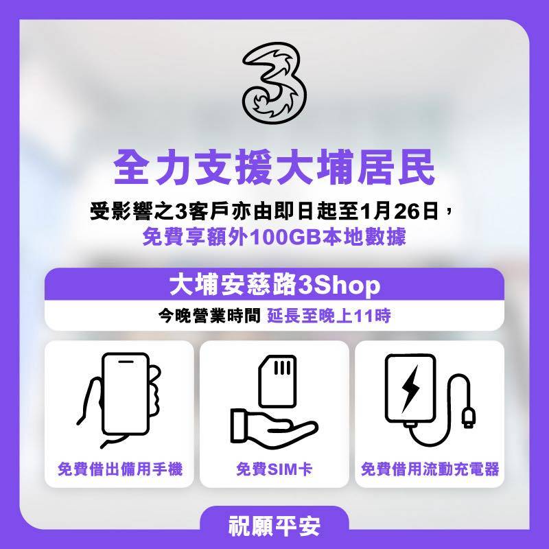 受影響的3客戶亦由即日起至1月26日,可免費享額外100GB本地數據,方便隨時接收最新消息及保持聯繫。
