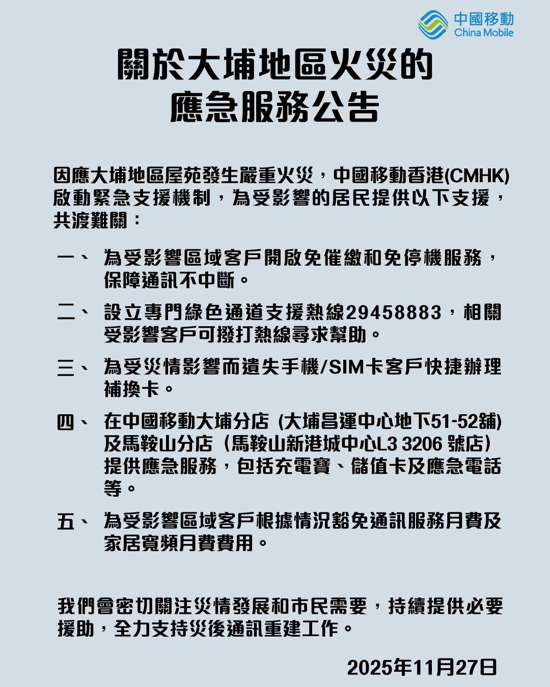 因應大埔地區屋苑發生嚴重火災,中國移動香港(CMHK)11月27日起啟動緊急支援機制,為受影響的居民提供以下支援,共渡難關: