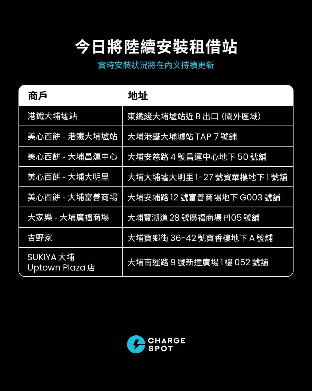 【大埔電力緊急支援|充電器供應更新】為協助附近受影響人士保持連繫,CHARGESPOT 即時起於大埔區提供160小時免費充電器租借,直至另行通知。