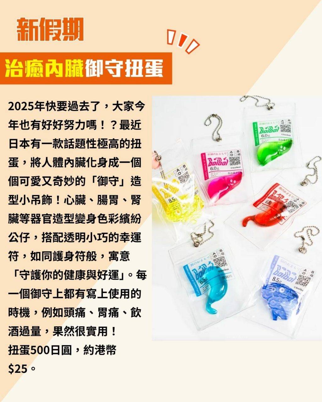 2025年快要過去了,大家今年也有好好努力嗎!?最近日本有一款話題性極高的扭蛋,將人體內臟化身成一個個可愛又奇妙的「御守」造型小吊飾!心臟、腸胃、腎臟等器官造型變身色彩繽紛公仔,搭配透明小巧的幸運符,如同護身符般,寓意「守護你的健康與好運」。每一個御守上都有寫上使用的時機,例如頭痛、胃痛、飲酒過量,果然很實用!