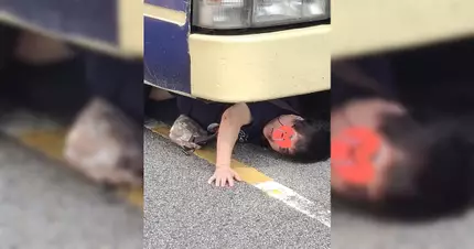 女子被捲入車底,由網上圖片可見,女子幾乎整個人被困車底,但她仍然清醒,露出驚恐表情。(圖片來源:香港突發事故報料區及討論區)